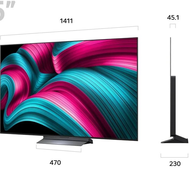 ضخامت بدنه به 45.1 میلیمتر میرسد و میتوان گفت یکی از نمایشگرهای باریک موجود در بازار به شمار میرود. این مدل در حالت نصب دیواری، به صورت کامل بر روی دیوار فیکس شده و همچون یک اثر هنری خواهد درخشید. برای نصب تلویزیون 65 اینچ ال جی C5 بر روی دیوار میتوانید از براکت دیواری (VESA) با ابعاد 200X300 میلیمتر استفاده نمایید.